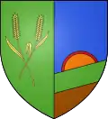 - Parti, au premier de sinople à deux épis de blé feuillus et tigés d’or, les tiges passées en sautoir, au second d’azur, à la barre de sinople soutenue d’une champagne de tanné, un demi besant d’orangé bordé de gueules issant de la barre, qui est d’Andelu des Yvelines → voir illustration « champagne de tanné »