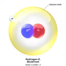 - (Chimie) Isotope stable de l’hydrogène dont le noyau contient un proton et un neutron. Le symbole chimique est D, la notation isotopique 2H.