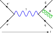Diagramme de Feynman représentant l’annihilation d’un électron et d’un positron en un photon, suivie de la création d’une paire quark-antiquark, l’antiquark émettant un gluon.