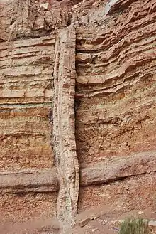 - (Géologie) (Anglicisme) Lame de roche magmatique qui s’est infiltrée dans une fissure de l’encaissant, pouvant donner un relief de colonne ou de mur naturel par érosion de ce dernier.