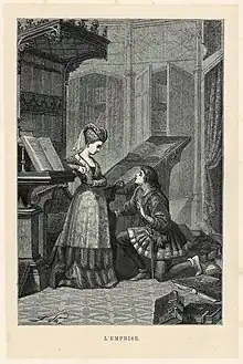 — (Stendhal, De l’Amour, 1822, 1re préface de 1826)Cette pitoyable comédie, entremêlée de bouquets, de parures, de parties de spectacle, s’appelle faire la cour à sa prétendue.