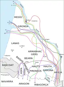 Carte des principales isoglosses du gascon. On voit un très net faisceau d'isoglosses au niveau de l’Ariège, marquant ici la séparation entre gascon et languedocien sud-occidental.