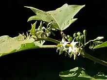 - (Botanique) (Nouvelle-Calédonie) Non vernaculaire en Nouvelle-Calédonie de l'aubergine pois, plante arbustive envahissante introduite.
