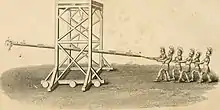 - (Militaire, Histoire) Machine de guerre médiévale, composé d'un bélier suspendu avec des cordages dans une tour en bois. Par un mouvement de balancier le bélier pouvait enfoncer des portes.
