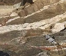 — (L. Van Wambeke, « Quelques nouveaux minéraux phosphatés du Congo : la landésite-(Fe), la barbosalite et la triplite », dans le Bulletin de la Société belge de géologie, de paléontologie et d'hydrologie, 1968, vol. 76-77, page 199)Dans le cas d’un filon rocheux issu de l’injection de magma dans une faille, le filon sera plus récent que la roche encaissante.