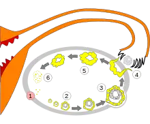 Évolution de l'ovaire : 1. follicule primordial, primaire et secondaire 2. follicule de De Graaf 4. ovulation 5. corps jaune.