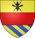 - Tiercé en fasce : au I d’or au foudre ailé de sable ; au II de gueules plain ; au III bandé d’or et d’azur, qui est de la famille Constantin → voir illustration « armoiries avec un foudre ailé »