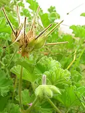 Fruit laissant apparaître quelques graines d'un géranium (2) (Pelargonium sp.).