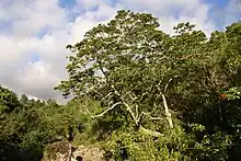 Le grand natte est un grand arbre [...] au tronc généralement droit (photo 5), pouvant atteindre 20 m de hauteur. Ses feuilles contenant du latex sont simples, alternes et groupées à l’extrémité des rameaux [...].