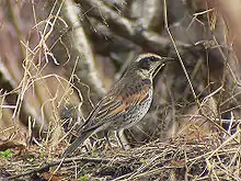 - (Ornithologie) Espèce de petit oiseau passereau, grive d'Asie et parfois en Europe, proche de la grive de Naumann, à sourcil pâle, aux ailes brun-roux.