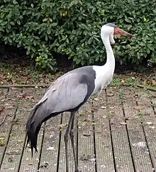 - (Ornithologie) Espèce d’oiseau grand échassier, une grue, la plus grande d’Afrique, avec des caroncules pendant de la gorge, au plumage blanc, gris et noir, et à l’avant de la face nu et rouge.