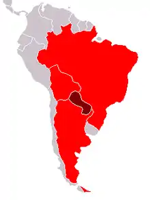 En rouge les lieux où sont parlés des variétés de guarani, en rouge sombre le Paraguay ou le guarani est langue officielle.