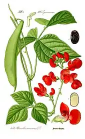 - (Botanique) Plante grimpante tropicale qui était anciennement cultivée en altitude en Amérique Centrale pour ses grains secs ou verts alors qu'en Europe et aux États-Unis elle est cultivée comme plante ornementale pour ses fleurs rouges.