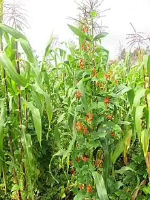 Un pied de haricot maïs entortillé sur la tige du maïs. (sens 1)