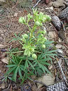 - (Botanique) Espèce d’hellébore, plante herbacée au feuillage persistant, à feuilles profondément divisées en 7 à 11 segments et à fleurs vertes symétriques en clochettes penchées.