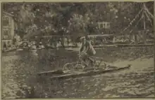 - (Désuet) Bicyclette aquatique munie de flotteurs et d’une roue à aubes mues par le pédalier.
