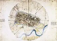 Leonardo da Vinci, Carte de la ville d'Imola (Italie), 1502, (sous-dessin à la craie noire, plume et encre, lavis coloré, 440 x 602 mm), Bibliothèque royale, Château de Windsor