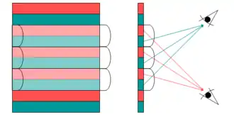 Principe d’imagerie lenticulaire : suivant l’angle de vision, on voit l’image rouge ou bien l’image verte.