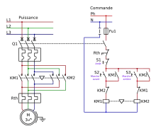 L’interverrouillage électrique (les contacts à ouverture en amont des contacteurs) et mécanique (le triangle pointe en bas) des deux bobines des contacteurs empêche le court-circuit L1-L2.
