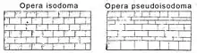 — (Vitruve, De architectura)- Pour la même raison, nous ne devons point rejeter l'espèce de maçonnerie employée par les Grecs, quand ils ne se servent pas de cette pierre tendre que l'on polit pour la mettre en oeuvre. Ils se contentent, au lieu de pierres de taille, de cailloux ou de pierres dures qu'ils arrangent comme des assises de briques en les posant en liaison les unes sur les autres, ce qui donne à cette espèce de maçonnerie une solidité que rien ne peut ébranler. Elle se fait de deux casanières : l'une que l'on appelle isodomon, l'autre pseudisodomon. L'isodomon est celle dont les assises sont toutes d'une égale hauteur ; la pseudisodomon, celle dont les assises présentent une épaisseur inégale.