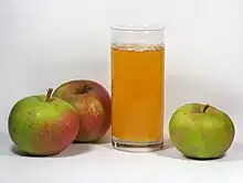 - (Indénombrable) Jus extrait de la pomme utilisé comme boisson (soit directement, soit après avoir été concentré puis reconstitué par addition d’eau).