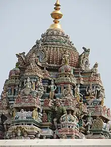 Kalasam doré au sommet d’un gopura dans le Tamil Nadu (Inde)