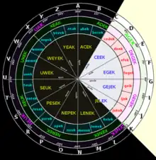 - Zone radiale entre K et C (roue matricielle), la zone qui s’étend de K à C dans le sens dextrorsum, c’est-à-dire la majeure partie du disque.