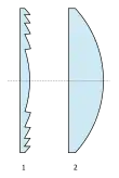Coupe d'une lentille de Fresnel (1) et d'une lentille plan-convexe (2) de distance focale équivalente.