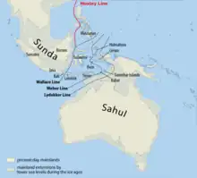 - Cette barrière marine, connue sous le nom de ligne Wallace, a également constitué une frontière biologique expliquant l'absence de mammifères placentaires et d'hommes présapiens sur le Sahul et celle de marsupiaux australiens sur le Sunda.— (Daniel Frimigacci, Bernard Vienne, Aux temps de la terre noire: ethnoarchéologie des îles Futuna et Alofi, Peeters Publish., Paris, 1991, page 30)