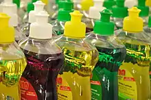 - Anglais : washing-up liquid (en) (Royaume-Uni), dishwashing liquid (en) (États-Unis), dish soap (en) (États-Unis)