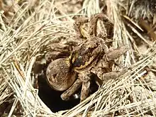 Une lycose de Narbonne sur le bord de son terrier.