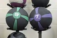 - (Sport) Ballon lesté utilisé pour les exercices de musculation ou d'assouplissement.