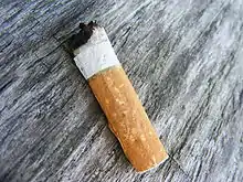 - (Par extension) Cigarette ou cigare presque entièrement consumés.
