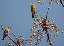 Fruits de mélia azedarach et verdiers de Chine Carduelis sinica.