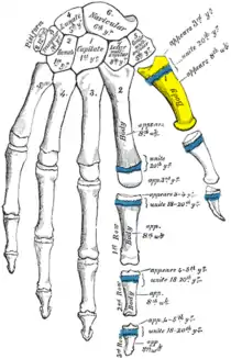 Schéma du squelette d'une main. En jaune, le métacarpe.