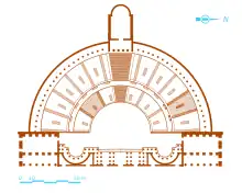 La cavea du théâtre de Pompée est partagée en deux maeniana : celui du bas est divisé en sept cunei de gradins, celui du haut comprend onze cunei.
