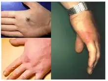 - (Médecine, Médecine vétérinaire) Maladie contagieuse, qui se caractérise par des plaques érythémateuses inflammatoires violacées, avec douleur, sensation de brûlure et prurit au site d’inoculation. Elle s’attrape généralement en se piquant avec des os de porc ou des arrêtes de poisson. Elle est due à une bactérie nommée Erysipelothrix rhusiopathiæ.