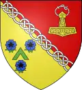 - Tranché : au 1er de gueules au marteau de Thor d’or au décor diapré avec attache en anneau d’argent, au 2e d’or au chevronnel alésé de sinople accompagné de trois fleurs de lin d’azur, à l’entrelacs de nœuds de carrick d’argent brochant sur la partition, qui est de la commune de Turretot de Seine-Maritime → voir illustration « armoiries avec un marteau de Thor »