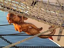 Apoyado en una esquina se encontraba el mascarón de proa de un barco : la estropeada imagen a tamaño real de una mujer con largos cabellos que ondeaban a sus espaldas.