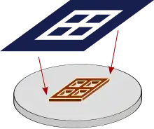 Utilisation d’un masque photographique (en haut) pour créer une couche mince d’un circuit intégré (en bas) en photolithographie.
