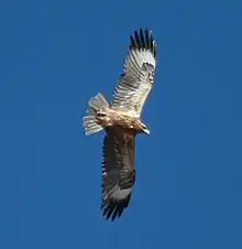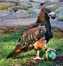 - (Ornithologie) Espèce d'oiseau rapace diurne (falconiforme) de la famille des accipitridés, un grand rapace d'Australie au plumage sombre, à poitrine et face inférieure du cou noirs, avec des taches claires sur les ailes.