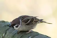 - (Ornithologie) Espèce de petit oiseau passereau d’Eurasie, de nom scientifique Passer montanus, introduit en Australie et aux États-Unis, moineau reconnaissable à sa calotte marron et aux taches noires en forme de virgule sur les joues, très remuant.