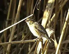 - (Ornithologie) Espèce de petit oiseau passereau d’Eurasie et du nord de l’Afrique, moineau à calotte étroite, au sourcil blanchâtre épais, au dos et aux ailes rayés de brun.