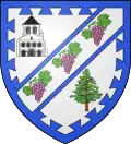 - D’argent à la bordure mortaisée d’azur, à la barre brochante du même chargée d’une autre barre du champ surchargée de trois grappes de raisin de pourpre feuillées de sinople posées à plomb, accompagnée en chef de l’église du lieu au trait couverte ouverte et ajourée de sable et en pointe d’un pin au naturel, qui est de Saint-Martin-de-Coux → voir illustration « bordure mortaisée »