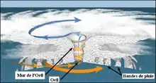 Diagramme illustrant l’œil d’un cyclone, où l’on peut voir le mur de l’œil entourant celui-ci.