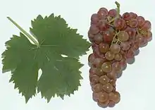 Feuille et grappe du cépage muscat à petits grains rouges.