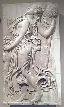 Ménade dansant, portant la nébride autour du cou et le thyrse à la main.