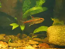 - (Ichtyologie) Petit poisson argenté avec une bande latérale d’un rose vif, endémique du fleuve Essequibo au Guyana, fréquemment élevé en aquariophilie.