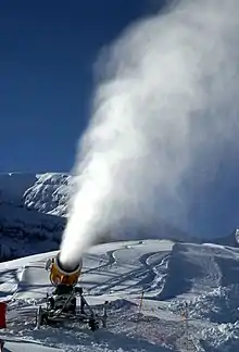 - (Ski alpin, Snowboard) Neige dont la formation est provoquée volontairement par l’homme au moyen d’un canon à neige.