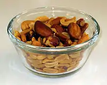 - (Cuisine) Ensemble de divers fruits à coque cuits, salés ou sucrés, comme des amandes, des cacahuètes, des noix de cajou et des noix de macadamia.